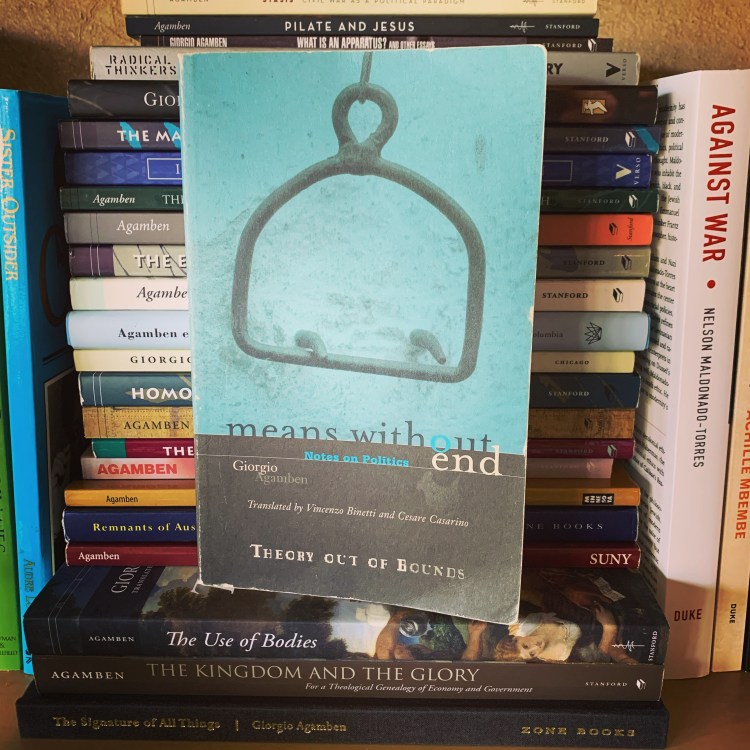 Of contemporary thinkers of note that I have more recently come to appreciate, I would count the Italian philosopher Giorgio Agamben highly amongst them. His gaining popularity in the Anglophone world can be attested by the increasing number of English translations being published as well as the many references to be found in recently published works. Much to his credit, Agamben has introduced a bevy of key concepts that have proven significant for critical scholarship these days. But like Fred Moten, Agamben’s writing can dense and challenging at times. The time that I invest in reading him, however, typically seems to be worth the effort. As can be spied in the background, Agamben has been prolific and I hope to share more of these titles in the future. Today, I am featuring the text that served as my introduction to him. “Means without Ends: Notes on Politics” is a set of essays gathered into a slim volume. Because of its brevity, the ideas herein, concerning matters like refugees and biopolitics, offer only a brief glimpse into his broader world of thought. Nevertheless, this work continues to serve as a productive provocation for my present undertaking and proved, upon my first encounter with it, to be the start of a much longer intellectual engagement. Ramadan 29