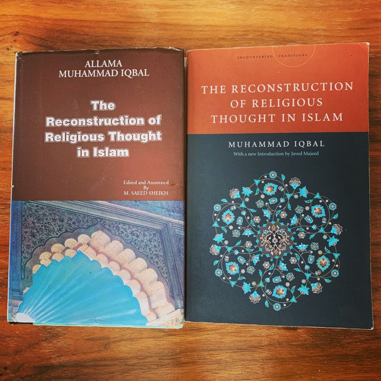 During my undergraduate years I was exposed to Muhammad Iqbal’s (d. 1938) “The Reconstruction of Religious Thought in Islam.” This encounter coincided with my fascination with the Western philosophical tradition, which only made the text all the more engaging. I have continued revisiting Iqbal, including what poetry of his that has been translated, in the years since. While my reading of him has naturally shifted and changed over time, the original resonance of his project has remained an enduring thread in my thinking. My first copy of the book – purchased those many years ago – rests to the left. On the right, is the 2012 republication of the work by Stanford University Press, which has become the one I reference for citations. Let us end with a bit of Iqbal: “When attracted by the forces around him, man has the power to shape and direct them; when thwarted by them, he has the capacity to build a much vaster world in the depths of his own inner being, wherein he discovers sources of infinite joy and inspiration. Hard his lot and frail his being, like a rose-leaf, yet no form of reality is so powerful, so inspiring, and so beautiful as the spirit of man! Thus in his inmost being man, as conceived by the Qur’an, is a creative activity, an ascending spirit who, in his onward march, rises from one state of being to another: ‘But Nay! I swear by the sunset’s redness and by the night and its gatherings and by the moon when at her full, that from state to state shall ye be surely carried onward (84:16-19).’” (p. 10) Ramadan 19